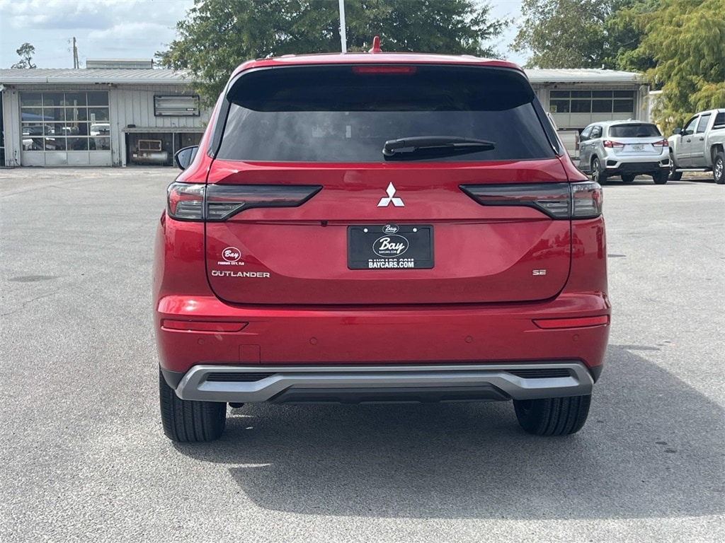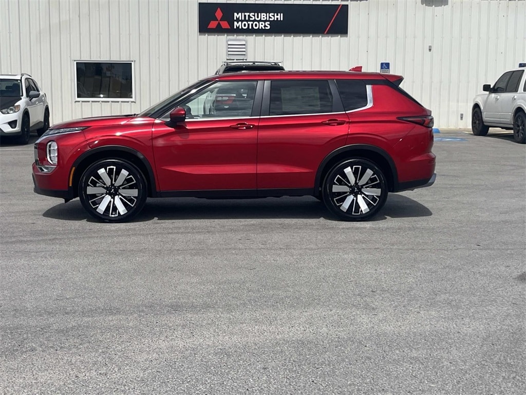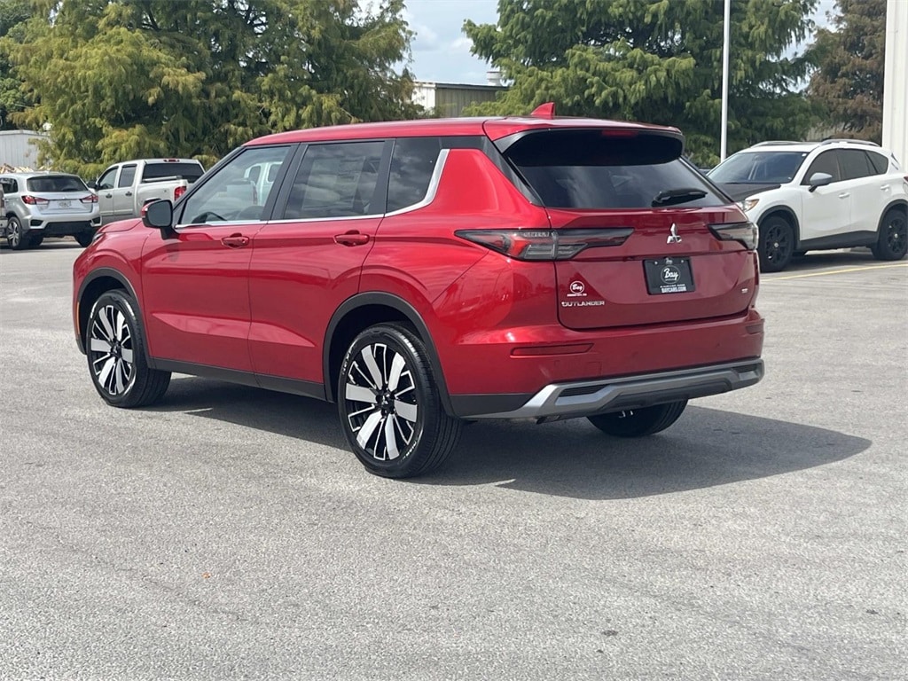 Red 2025 Mitsubishi Outlander SE FWD CVT 2.5L I4 DOHC 16V LEV3-SULEV30 181hp 3rd row seats: split-bench, 4-Wheel Disc Brakes, 8 Speakers, ABS brakes, Air Conditioning, Alloy wheels, AM/FM radio: SiriusXM, Android Auto & Apple CarPlay, Auto High-beam Headlights, Auto-dimming Rear-View mirror, Automatic temperature control, Brake assist, Bumpers: body-color, Driver door bin, Driver vanity mirror, Dual front impact airbags, Dual front side impact airbags, Electronic Stability Control, Emergency communication system: Mitsubishi Connect w/ 24-month trial, Exterior Parking Camera Rear, Four wheel independent suspension, Front anti-roll bar, Front Bucket Seats, Front Center Armrest w/Storage, Front dual zone A/C, Front fog lights, Front reading lights, Fully automatic headlights, Garage door transmitter: HomeLink, Heated door mirrors, Heated Front Bucket Seats, Heated front seats, Illuminated entry, Knee airbag, Leather Shift Knob, Leather steering wheel, Low tire pressure warning, Navigation System, Occupant sensing airbag, Outside temperature display, Overhead airbag, Overhead console, Panic alarm, Passenger door bin, Passenger vanity mirror, Power door mirrors, Power driver seat, Power Liftgate, Power steering, Power windows, Radio data system, Radio: AM/FM 12.3" Navigation w/Smartphone-Link, Rain sensing wipers, Rear anti-roll bar, Rear seat center armrest, Rear side impact airbag, Rear window defroster, Rear window wiper, Reclining 3rd row seat, Remote keyless entry, Security system, Speed control, Speed-Sensitive Wipers, Split folding rear seat, Spoiler, Steering wheel mounted audio controls, Synthetic Leather Seating Surfaces, Tachometer, Telescoping steering wheel, Tilt steering wheel, Traction control, Trip computer, Turn signal indicator mirrors, Variably intermittent wipers, Wheels: 20" Two-Tone Alloy.
