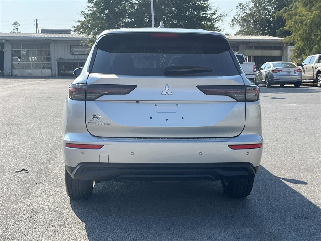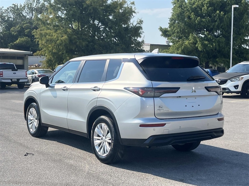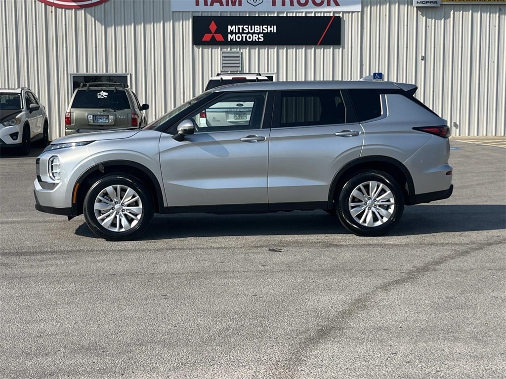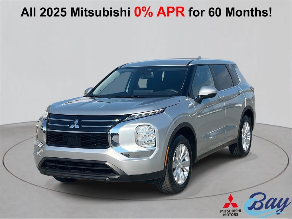 Silver 2025 Mitsubishi Outlander ES FWD CVT 2.5L I4 DOHC 16V LEV3-SULEV30 181hp 18" Alloy Wheels, 3rd row seats: split-bench, 4-Wheel Disc Brakes, 8 Speakers, ABS brakes, Air Conditioning, Alloy wheels, AM/FM radio: SiriusXM, Android Auto & Apple CarPlay, Auto High-beam Headlights, Auto-dimming Rear-View mirror, Automatic temperature control, Blind Spot Warning, Brake assist, Bumpers: body-color, Cloth Fabric Seating Surfaces, Driver door bin, Driver vanity mirror, Dual front impact airbags, Dual front side impact airbags, Electronic Stability Control, Emergency communication system: Mitsubishi Connect w/ 24-month trial, Exterior Parking Camera Rear, Four wheel independent suspension, Front anti-roll bar, Front Bucket Seats, Front Center Armrest w/Storage, Front dual zone A/C, Front reading lights, Fully automatic headlights, Illuminated entry, Knee airbag, Low tire pressure warning, Navigation System, Occupant sensing airbag, Outside temperature display, Overhead airbag, Overhead console, Panic alarm, Passenger door bin, Passenger vanity mirror, Power door mirrors, Power steering, Power windows, Radio data system, Radio: AM/FM 12.3" Navigation w/Smartphone-Link, Rear anti-roll bar, Rear Parking Sensors, Rear seat center armrest, Rear side impact airbag, Rear window defroster, Rear window wiper, Reclining 3rd row seat, Remote keyless entry, Security system, Speed control, Speed-Sensitive Wipers, Split folding rear seat, Spoiler, Steering wheel mounted audio controls, Tachometer, Telescoping steering wheel, Tilt steering wheel, Traction control, Trip computer, Turn signal indicator mirrors, Variably intermittent wipers.