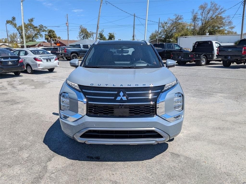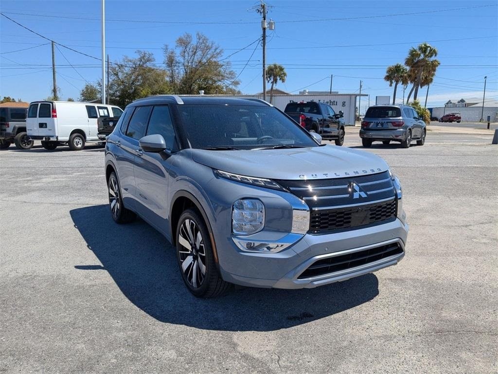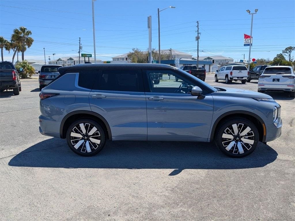 Gray 2025 Mitsubishi Outlander SEL FWD CVT 2.5L I4 DOHC 16V LEV3-SULEV30 181hp 3rd row seats: split-bench, 4-Wheel Disc Brakes, 8 Speakers, ABS brakes, Air Conditioning, Alloy wheels, AM/FM radio: SiriusXM, Android Auto & Apple CarPlay, Auto High-beam Headlights, Auto-dimming Rear-View mirror, Automatic temperature control, Brake assist, Bumpers: body-color, Driver door bin, Driver vanity mirror, Dual front impact airbags, Dual front side impact airbags, Electronic Stability Control, Emergency communication system: Mitsubishi Connect w/ 24-month trial, Exterior Parking Camera Rear, Four wheel independent suspension, Front anti-roll bar, Front Bucket Seats, Front Center Armrest w/Storage, Front dual zone A/C, Front fog lights, Front reading lights, Fully automatic headlights, Garage door transmitter: HomeLink, Heated door mirrors, Heated Front Bucket Seats, Heated front seats, Heated rear seats, Heated steering wheel, Illuminated entry, Knee airbag, Leather Appointed Seating Surfaces, Leather Shift Knob, Leather steering wheel, Low tire pressure warning, Memory seat, Navigation System, Occupant sensing airbag, Outside temperature display, Overhead airbag, Overhead console, Panic alarm, Passenger door bin, Passenger vanity mirror, Power door mirrors, Power driver seat, Power Liftgate, Power moonroof: Panoramic, Power passenger seat, Power steering, Power windows, Radio data system, Radio: AM/FM 12.3" Navigation w/Smartphone-Link, Rain sensing wipers, Rear air conditioning, Rear anti-roll bar, Rear seat center armrest, Rear side impact airbag, Rear window defroster, Rear window wiper, Reclining 3rd row seat, Remote keyless entry, Security system, Speed control, Speed-Sensitive Wipers, Split folding rear seat, Spoiler, Steering wheel mounted audio controls, Tachometer, Telescoping steering wheel, Tilt steering wheel, Traction control, Trip computer, Turn signal indicator mirrors, Variably intermittent wipers, Wheels: 20" Two-Tone Alloy.
