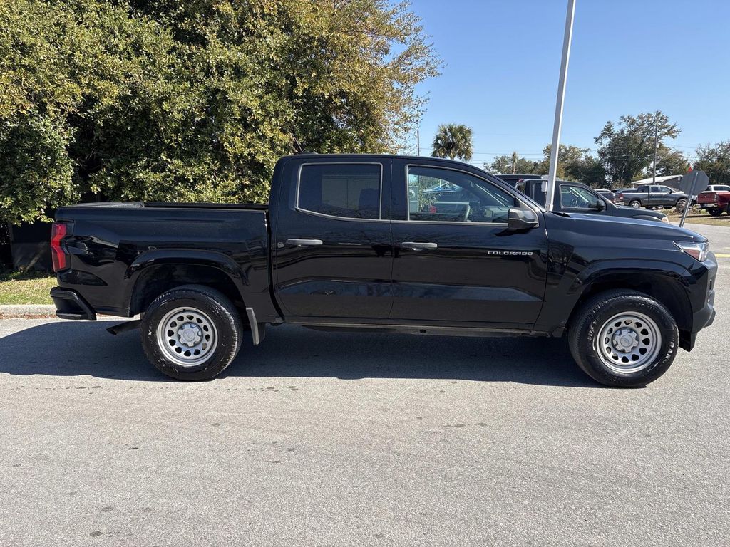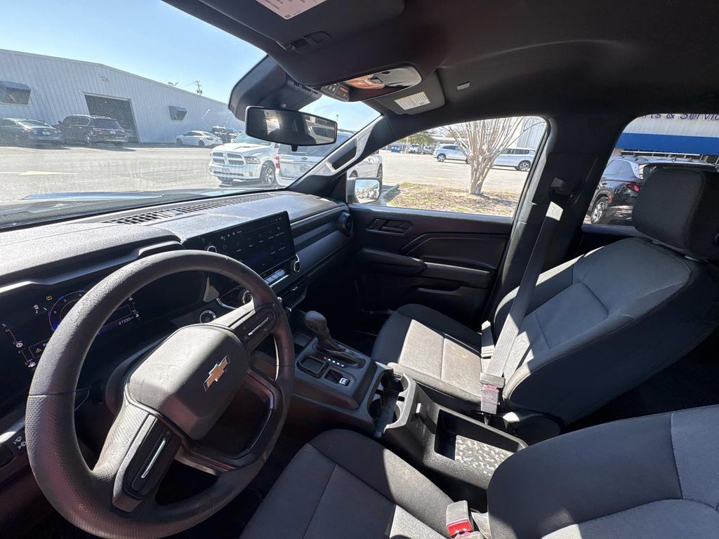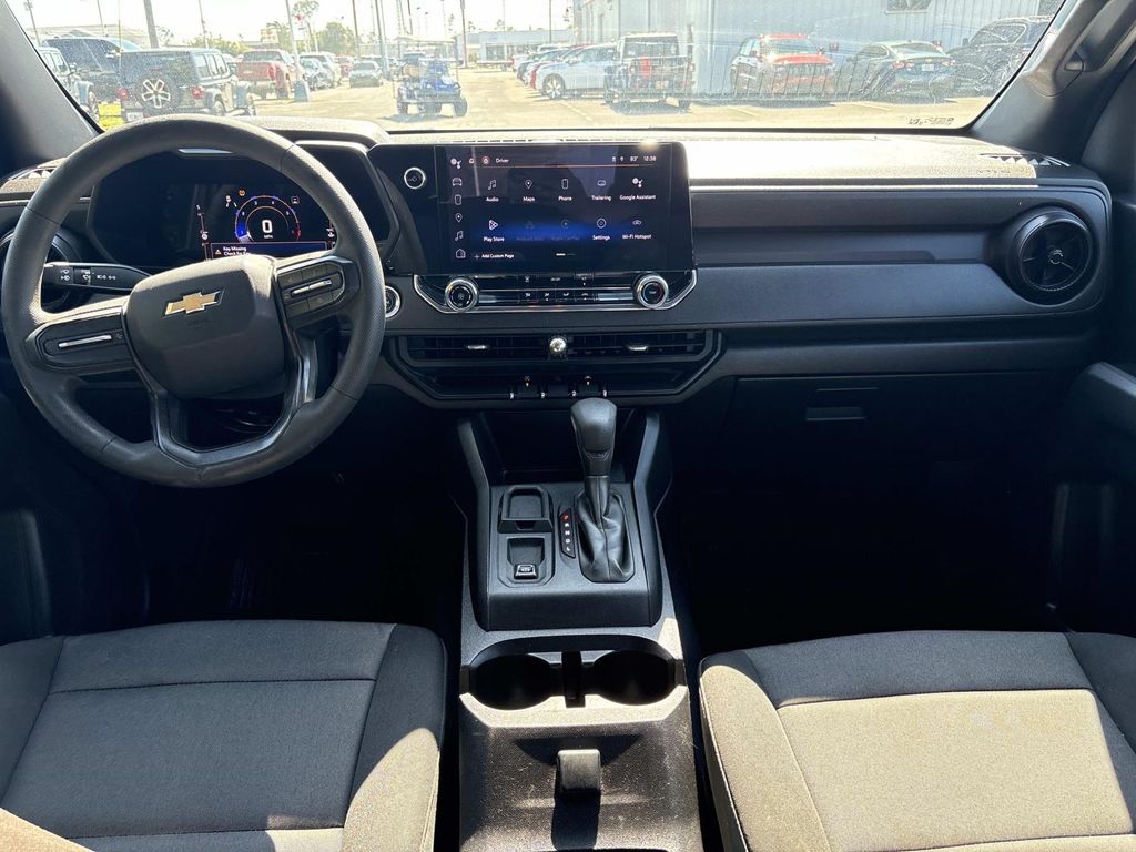 Chevy Safety Assist, Preferred Equipment Group 2WT, 3.42 Rear Axle Ratio, 4-Way Manual Passenger Seat Adjuster, 4-Wheel Disc Brakes, 6 Speakers, 6-Speaker Audio System Feature, 6-Way Manual Driver Seat Adjuster, ABS brakes, Air Conditioning, All-Weather Floor Mats, AM/FM radio: SiriusXM, Apple CarPlay/Android Auto, Auto High-beam Headlights, Automatic Emergency Braking, Brake assist, Cloth Seat Trim, Delay-off headlights, Driver door bin, Driver vanity mirror, Dual front impact airbags, Dual front side impact airbags, Electronic Stability Control, Following Distance Indicator, Forward Collision Alert, Front anti-roll bar, Front Bucket Seats, Front Center Armrest, Front Pedestrian & Bicyclist Braking, Front wheel independent suspension, IntelliBeam Automatic High Beam On/Off, Lane Keep Assist w/Lane Departure Warning, Low tire pressure warning, Navigation System, Occupant sensing airbag, Overhead airbag, Panic alarm, Passenger door bin, Passenger vanity mirror, Power door mirrors, Power steering, Power windows, Radio data system, Radio: 11.3" Diagonal Advanced Color LCD Display, Rear step bumper, Remote keyless entry, Security system, SiriusXM Radio, Speed-sensing steering, Split folding rear seat, Steering Wheel Mounted Audio Controls, Steering wheel mounted audio controls, Tachometer, Tilt steering wheel, Traction control, Trip computer, Variably intermittent wipers, Wheels: 17" x 8" Ultra Silver Metallic Steel, Wireless Phone Projection, Chevy Safety Assist, Preferred Equipment Group 2WT. Black 2024 Chevrolet Colorado Work Truck RWD 8-Speed Automatic 2.7L Turbo