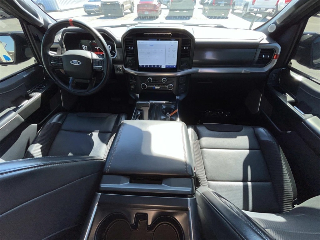 4WD, Equipment Group 801A Standard, Heated front seats, Heated rear seats, Leather Trim Seats w/Heated 2nd Row, Navigation system: Connected Navigation, Tough Bed Spray-In Bedliner, 17" Cast Aluminum Wheels, 18 Speakers, 4-Wheel Disc Brakes, ABS brakes, Adaptive suspension, Adjustable pedals, Air Conditioning, Alloy wheels, AM/FM radio: SiriusXM with 360L, Auto High-beam Headlights, Auto Start-Stop Removal (DISC), Auto tilt-away steering wheel, Auto-dimming door mirrors, Auto-dimming Rear-View mirror, Automatic temperature control, Brake assist, Bumpers: body-color, Compass, Delay-off headlights, Driver door bin, Driver vanity mirror, Dual front impact airbags, Dual front side impact airbags, Electronic Locking w/4.10 Axle Ratio, Electronic Stability Control, Emergency communication system, Exterior Parking Camera Rear, Front anti-roll bar, Front Bucket Seats, Front Center Armrest, Front dual zone A/C, Front fog lights, Front reading lights, Front wheel independent suspension, Fully automatic headlights, Garage door transmitter, GVWR: 7,300 lbs Payload Package, Heated door mirrors, Heated steering wheel, Illuminated entry, Inclination/Intrusion Sensor Removal, Lane Departure Warning System, Low tire pressure warning, Memory seat, Occupant sensing airbag, Outside temperature display, Overhead airbag, Overhead console, Panic alarm, Partitioned Lockable Fold-Flat Storage, Passenger door bin, Passenger vanity mirror, Pedal memory, Power door mirrors, Power driver seat, Power passenger seat, Power steering, Power windows, Pro Power Onboard - 2KW, Radio data system, Radio: B&O Unleashed Sound System by Bang & Olufsen, Rain sensing wipers, Rear reading lights, Rear step bumper, Rear window defroster, Remote keyless entry, Security system, Speed control, Speed-sensing steering, Split folding rear seat, Steering Wheel Heat Removal (DISC), Steering wheel memory, Steering wheel mounted audio controls, SYNC 4 w/Enhanced Voice Recognition, Tachometer, Telescoping steering wheel, Tilt steering wheel, Traction control, Trip computer, Turn signal indicator mirrors, Variably intermittent wipers, Ventilated front seats, 4WD, Equipment Group 801A Standard, Heated front seats, Heated rear seats, Leather Trim Seats w/Heated 2nd Row, Navigation system: Connected Navigation, Tough Bed Spray-In Bedliner. Agate Black Metallic 2023 Ford F-150 Raptor 4WD 10-Speed Automatic 3.5L V6 EcoBoost