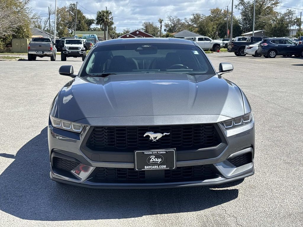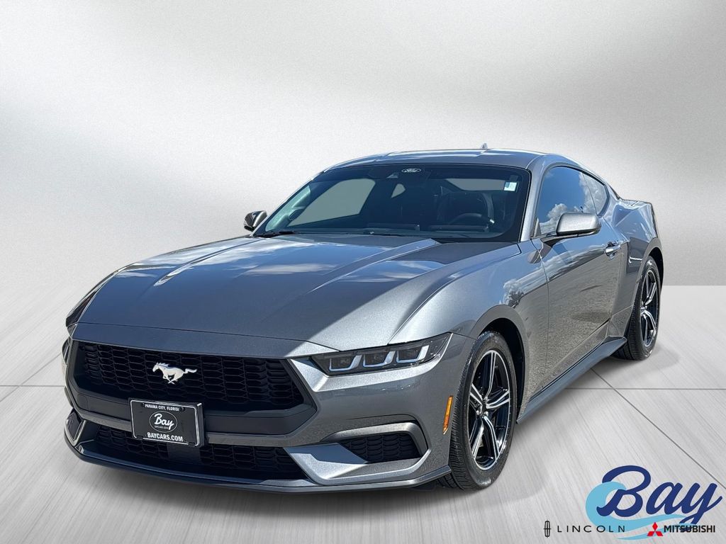 4-Wheel Disc Brakes, ABS brakes, Air Conditioning, Alloy wheels, AM/FM Stereo, Auto High-beam Headlights, Automatic temperature control, Brake assist, Bumpers: body-color, Compass, Delay-off headlights, Driver door bin, Driver vanity mirror, Dual front impact airbags, Dual front side impact airbags, Electronic Stability Control, Emergency communication system: 911 Assist, Exterior Parking Camera Rear, Four wheel independent suspension, Front anti-roll bar, Front Bucket Seats, Front Center Armrest, Front reading lights, Fully automatic headlights, Illuminated entry, Knee airbag, Leather Shift Knob, Low tire pressure warning, Occupant sensing airbag, Outside temperature display, Overhead airbag, Overhead console, Panic alarm, Passenger door bin, Passenger vanity mirror, Power door mirrors, Power steering, Power windows, Radio data system, Rain sensing wipers, Rear anti-roll bar, Rear Parking Sensors, Rear window defroster, Remote keyless entry, Speed control, Speed-sensing steering, Speed-Sensitive Wipers, Split folding rear seat, Sport steering wheel, Steering wheel mounted audio controls, SYNC 4.0 QNX, Tachometer, Telescoping steering wheel, Tilt steering wheel, Traction control, Trip computer, Variably intermittent wipers, Voltmeter, Wheels: 18" x 8" Machined-Face Aluminum. Gray Metallic 2024 Ford Mustang EcoBoost RWD 10-Speed Automatic EcoBoost 2.3L I4 GTDi DOHC Turbocharged VCT