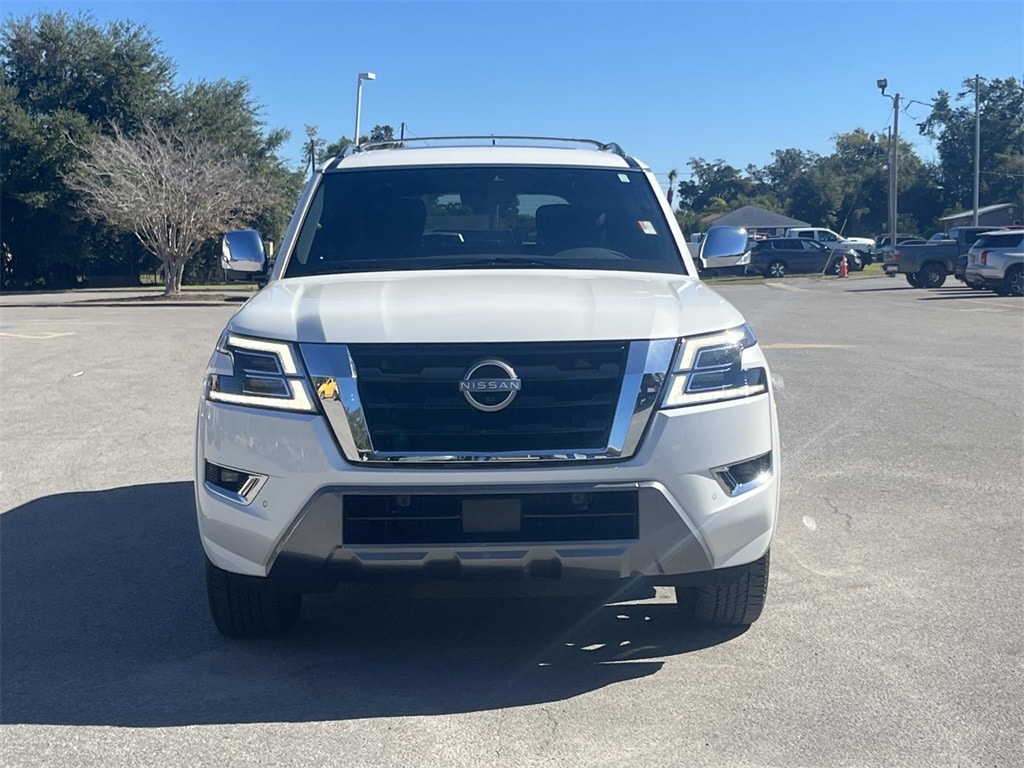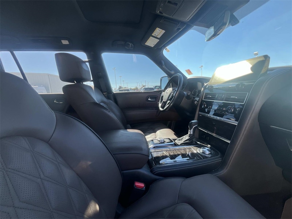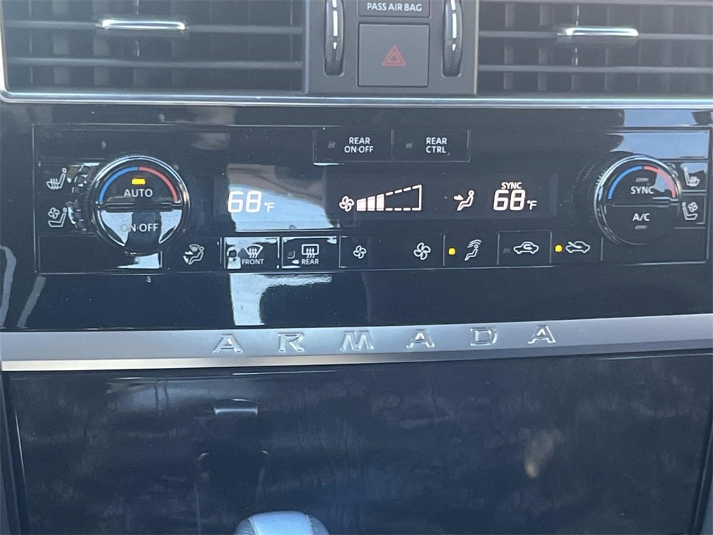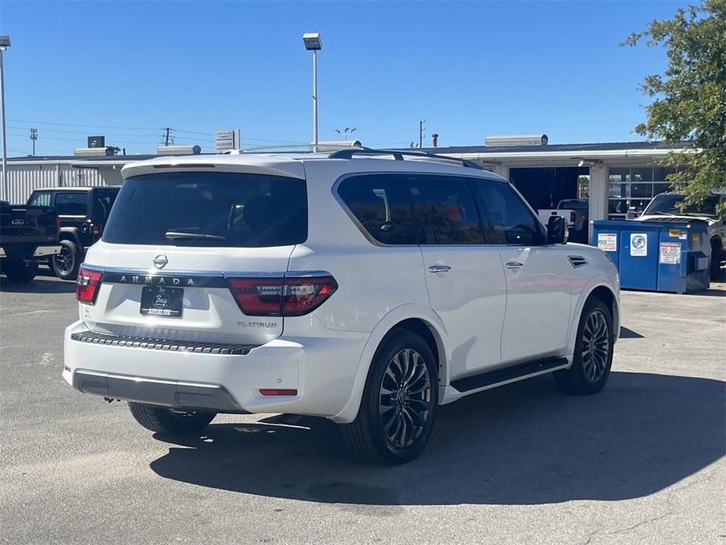 4WD, 3rd row seats: split-bench, Heated front seats, Heated rear seats, Navigation System, Power moonroof, Rear air conditioning, Rear-Seat Entertainment, Wheels: 22" x 8J Machine-Faced w/Tinted Clear Coat, 13 Speakers, 2.94 Axle Ratio, 2nd Row Captain's Chairs, 2nd Row Center Console w/Padded Armrest, 3rd Row Carpeted Floor Mats - Captain Seat, 4-Wheel Disc Brakes, A/V remote, ABS brakes, Air Conditioning, Alloy wheels, AM/FM radio: SiriusXM, Anti-whiplash front head restraints, Auto High-beam Headlights, Auto tilt-away steering wheel, Auto-dimming door mirrors, Auto-dimming Rear-View mirror, Auto-leveling suspension, Automatic temperature control, Bose 13-Speaker Premium Audio System, Brake assist, Bumpers: body-color, Captain's Chairs Package, Cargo Package, Climate-Controlled Front Bucket Seats, Cross Bars, Delay-off headlights, Driver door bin, Driver vanity mirror, Dual front impact airbags, Dual front side impact airbags, Electronic Stability Control, Emergency communication system: NissanConnect Services, Exterior Parking Camera Rear, Four wheel independent suspension, Front anti-roll bar, Front Bucket Seats, Front Center Armrest, Front dual zone A/C, Front fog lights, Front reading lights, Fully automatic headlights, Garage door transmitter: HomeLink, Headphones, Heated door mirrors, Heated steering wheel, Illuminated entry, Illuminated Kick Plates, Illuminated Scuff Plate, Knee airbag, Leather Shift Knob, Low tire pressure warning, Memory seat, Nissan USB Charging Cable Set, NissanConnect featuring Apple CarPlay and Android Auto, Occupant sensing airbag, Outside temperature display, Overhead airbag, Overhead console, Panic alarm, Passenger door bin, Passenger vanity mirror, Power door mirrors, Power driver seat, Power Liftgate, Power passenger seat, Power steering, Power windows, Premium audio system: Bose, Quilted Leather Seat Trim, Radio: NissanConnect w/SiriusXM, Rain sensing wipers, Rear anti-roll bar, Rear reading lights, Rear seat center armrest, Rear window defroster, Rear window wiper, Reclining 3rd row seat, Remote keyless entry, Security system, Speed control, Speed-sensing steering, Speed-Sensitive Wipers, Split folding rear seat, Spoiler, Steering wheel memory, Steering wheel mounted audio controls, Tachometer, Telescoping steering wheel, Tilt steering wheel, Traction control, Trip computer, Turn signal indicator mirrors, Variably intermittent wipers, Ventilated front seats, Voltmeter, 4WD, 3rd row seats: split-bench, Heated front seats, Heated rear seats, Navigation System, Power moonroof, Rear air conditioning, Rear-Seat Entertainment, Wheels: 22" x 8J Machine-Faced w/Tinted Clear Coat. Aspen White Tricoat 2023 Nissan Armada Platinum 4WD 7-Speed Automatic 5.6L V8 DOHC 32V LEV3-ULEV125 400hp
