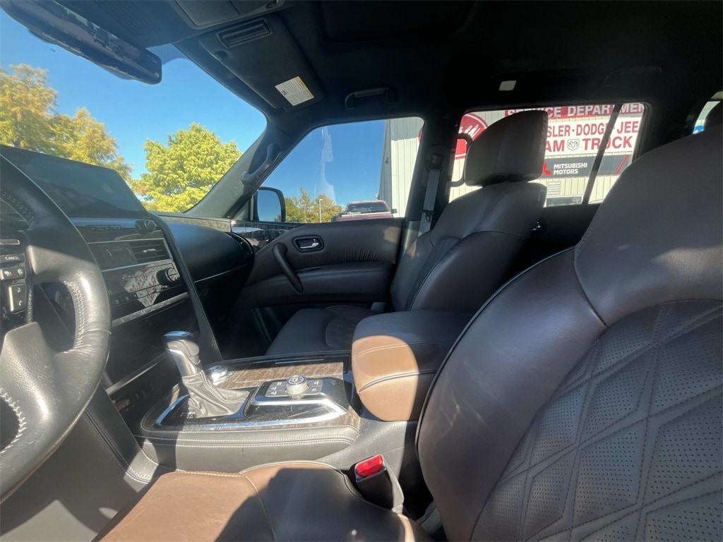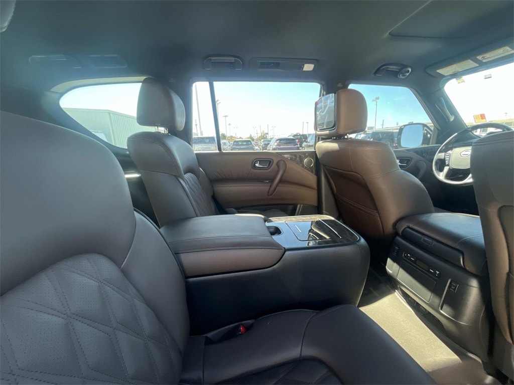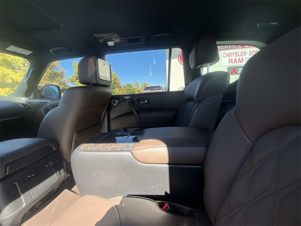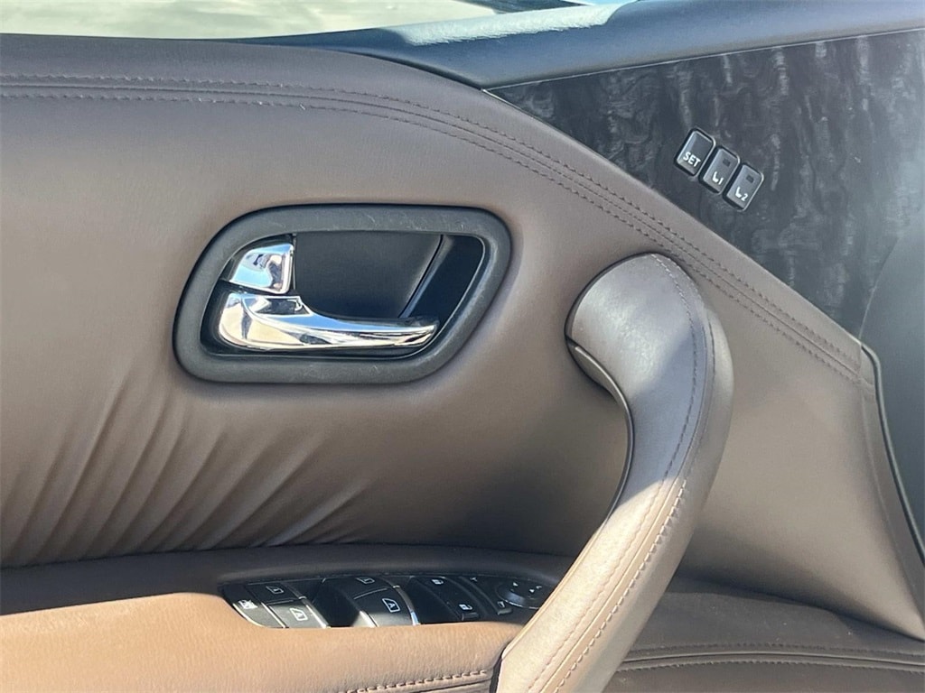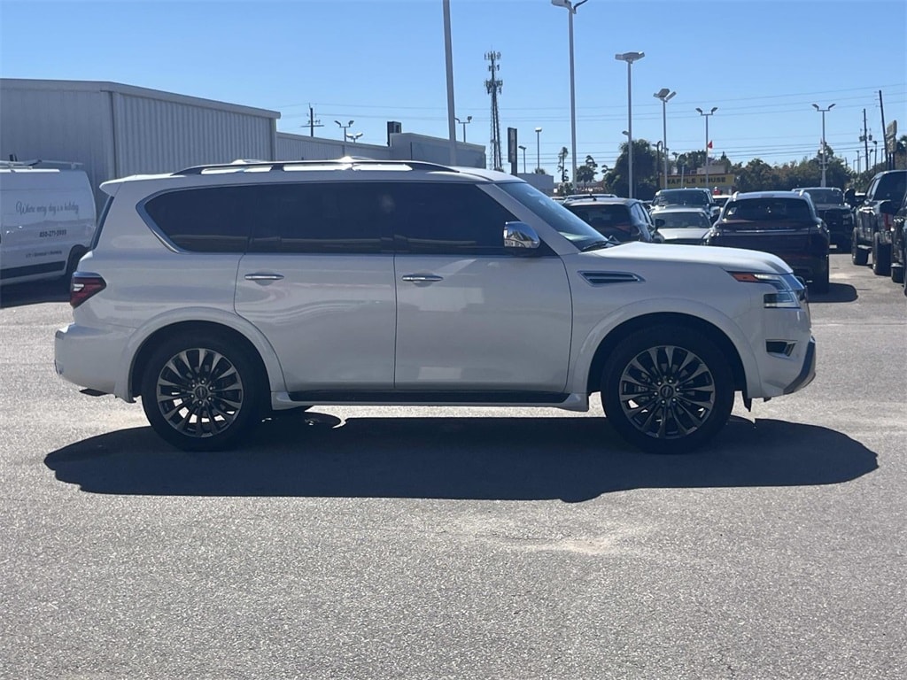 4WD, 3rd row seats: split-bench, Heated front seats, Heated rear seats, Navigation System, Power moonroof, Rear air conditioning, Rear-Seat Entertainment, Wheels: 22" x 8J Machine-Faced w/Tinted Clear Coat, 13 Speakers, 2.94 Axle Ratio, 2nd Row Captain's Chairs, 2nd Row Center Console w/Padded Armrest, 3rd Row Carpeted Floor Mats - Captain Seat, 4-Wheel Disc Brakes, A/V remote, ABS brakes, Air Conditioning, Alloy wheels, AM/FM radio: SiriusXM, Anti-whiplash front head restraints, Auto High-beam Headlights, Auto tilt-away steering wheel, Auto-dimming door mirrors, Auto-dimming Rear-View mirror, Auto-leveling suspension, Automatic temperature control, Bose 13-Speaker Premium Audio System, Brake assist, Bumpers: body-color, Captain's Chairs Package, Cargo Package, Climate-Controlled Front Bucket Seats, Cross Bars, Delay-off headlights, Driver door bin, Driver vanity mirror, Dual front impact airbags, Dual front side impact airbags, Electronic Stability Control, Emergency communication system: NissanConnect Services, Exterior Parking Camera Rear, Four wheel independent suspension, Front anti-roll bar, Front Bucket Seats, Front Center Armrest, Front dual zone A/C, Front fog lights, Front reading lights, Fully automatic headlights, Garage door transmitter: HomeLink, Headphones, Heated door mirrors, Heated steering wheel, Illuminated entry, Illuminated Kick Plates, Illuminated Scuff Plate, Knee airbag, Leather Shift Knob, Low tire pressure warning, Memory seat, Nissan USB Charging Cable Set, NissanConnect featuring Apple CarPlay and Android Auto, Occupant sensing airbag, Outside temperature display, Overhead airbag, Overhead console, Panic alarm, Passenger door bin, Passenger vanity mirror, Power door mirrors, Power driver seat, Power Liftgate, Power passenger seat, Power steering, Power windows, Premium audio system: Bose, Quilted Leather Seat Trim, Radio: NissanConnect w/SiriusXM, Rain sensing wipers, Rear anti-roll bar, Rear reading lights, Rear seat center armrest, Rear window defroster, Rear window wiper, Reclining 3rd row seat, Remote keyless entry, Security system, Speed control, Speed-sensing steering, Speed-Sensitive Wipers, Split folding rear seat, Spoiler, Steering wheel memory, Steering wheel mounted audio controls, Tachometer, Telescoping steering wheel, Tilt steering wheel, Traction control, Trip computer, Turn signal indicator mirrors, Variably intermittent wipers, Ventilated front seats, Voltmeter, 4WD, 3rd row seats: split-bench, Heated front seats, Heated rear seats, Navigation System, Power moonroof, Rear air conditioning, Rear-Seat Entertainment, Wheels: 22" x 8J Machine-Faced w/Tinted Clear Coat. Aspen White Tricoat 2023 Nissan Armada Platinum 4WD 7-Speed Automatic 5.6L V8 DOHC 32V LEV3-ULEV125 400hp